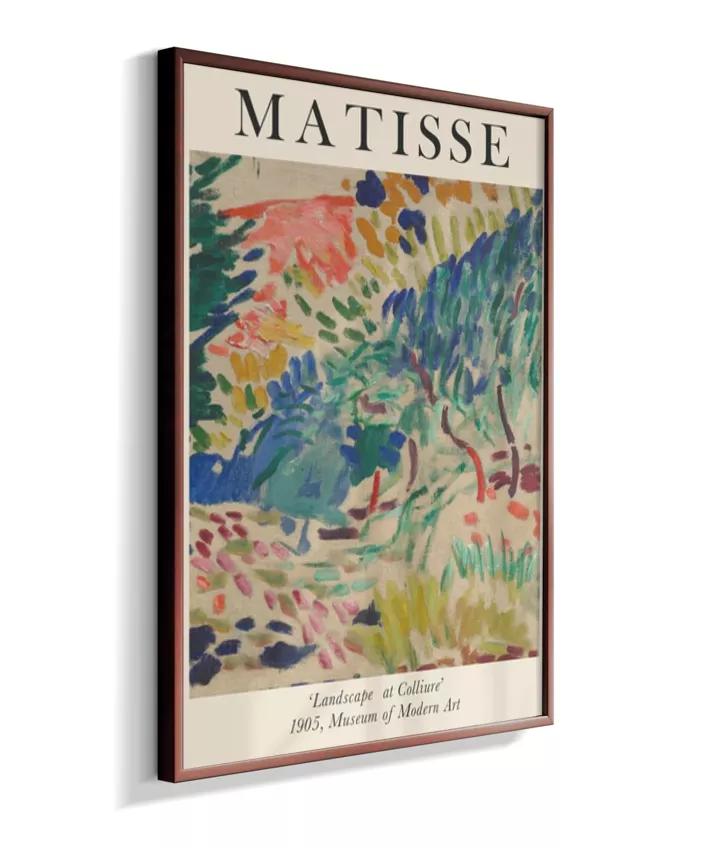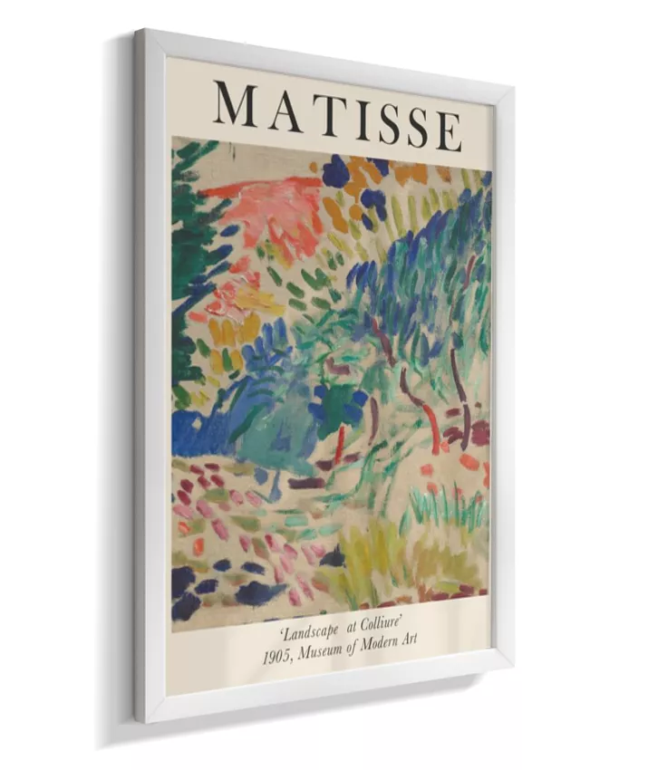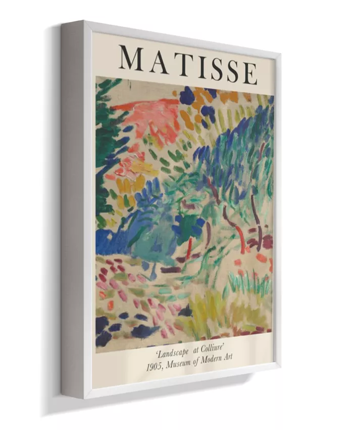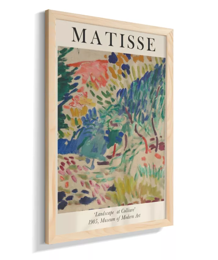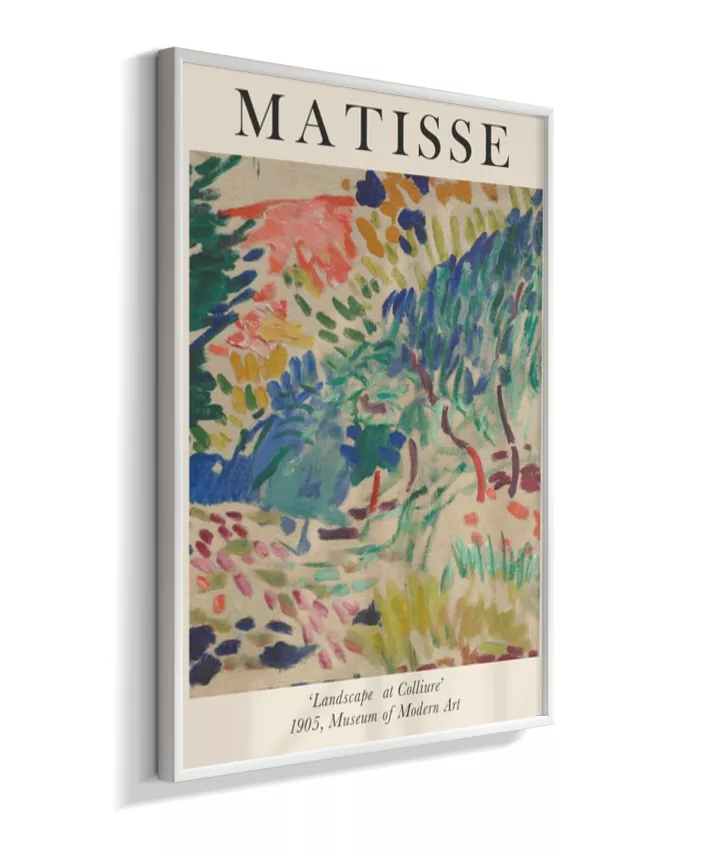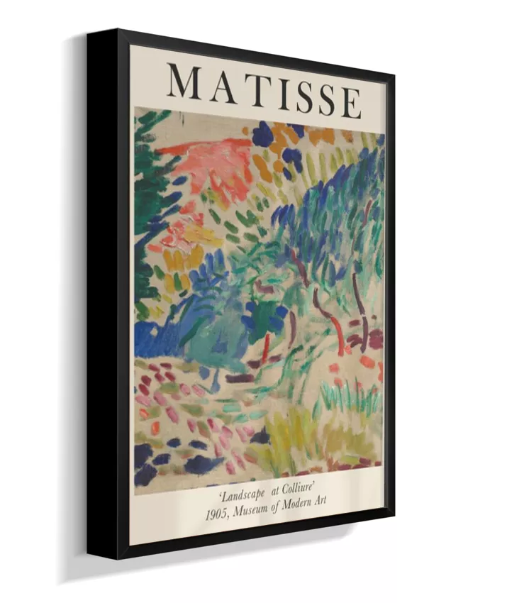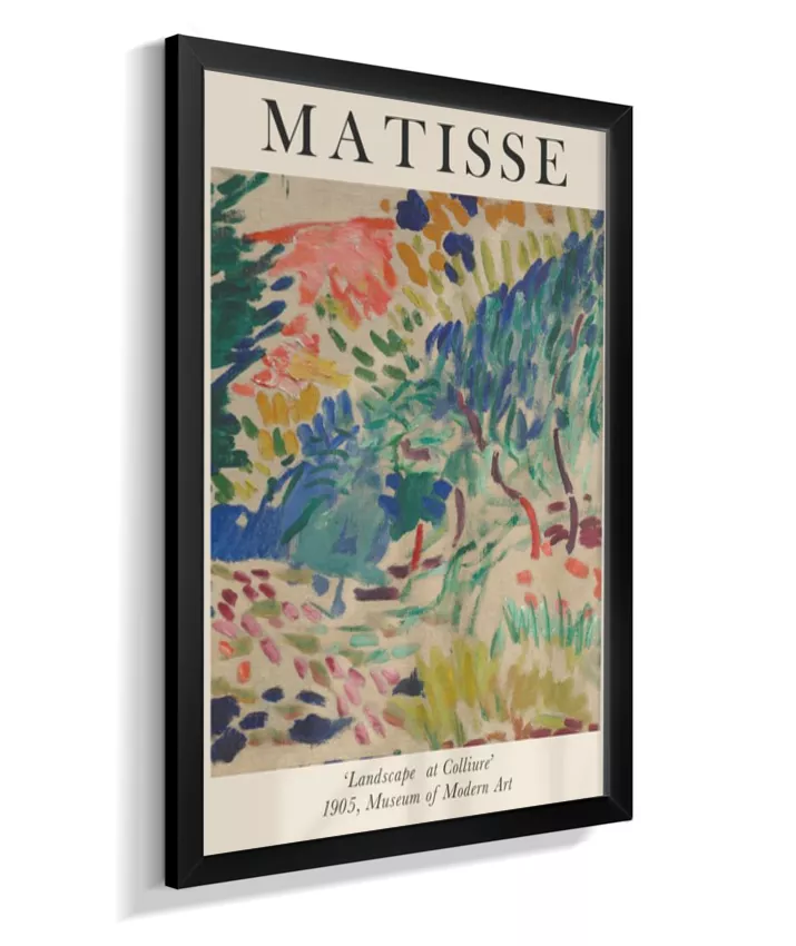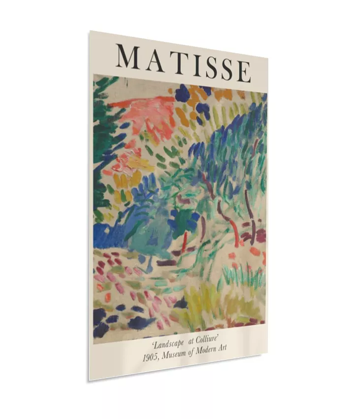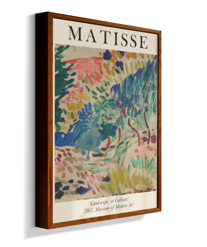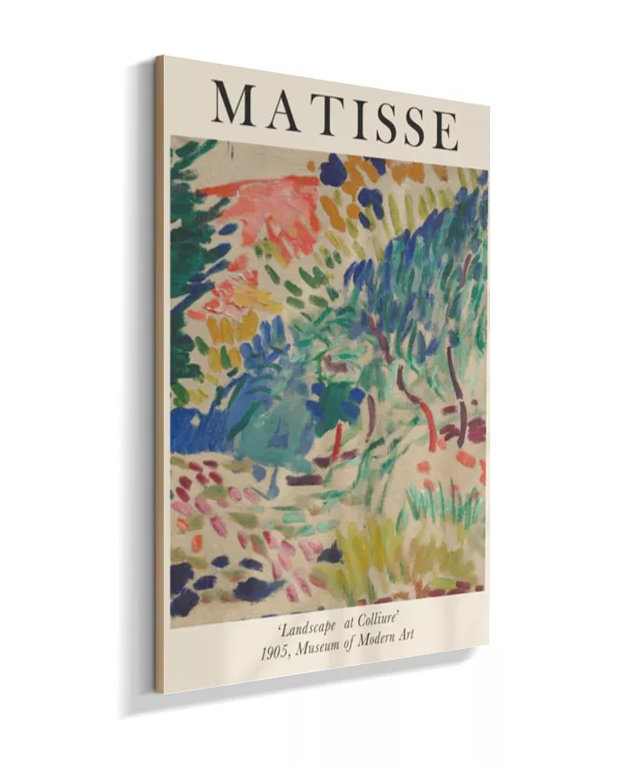Uma pintura de paisagem que captura a beleza natural de Collioure, com árvores e flores representadas em tons ousados e vívidos típicos do estilo Fauvismo.