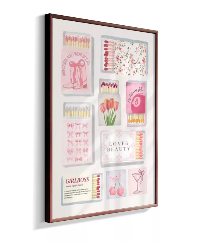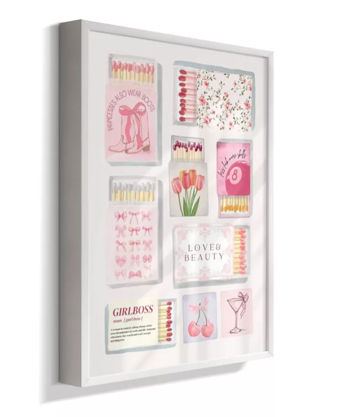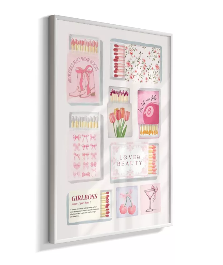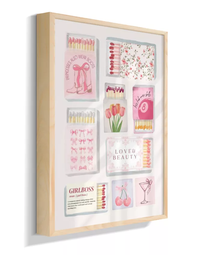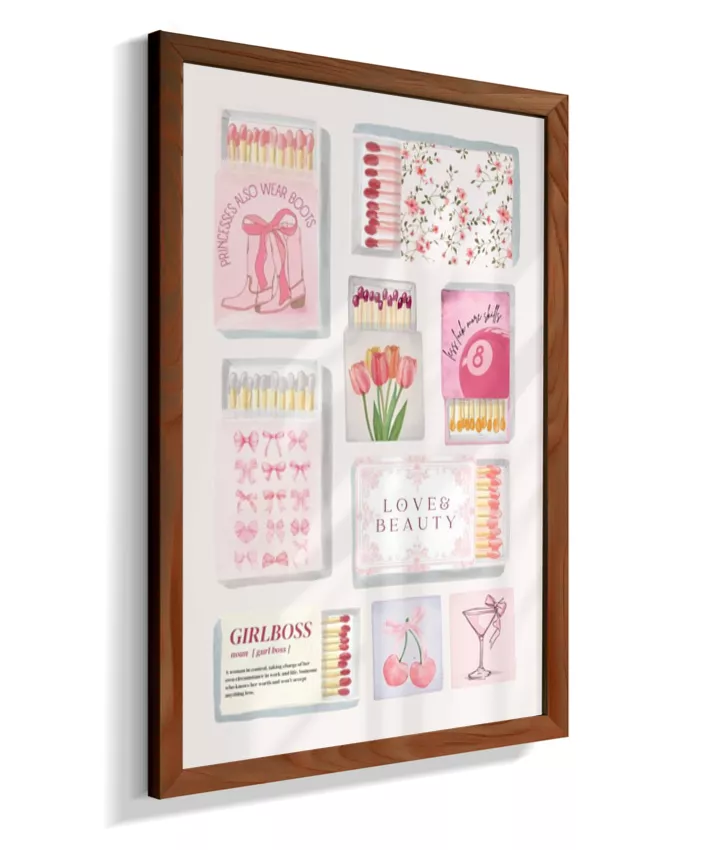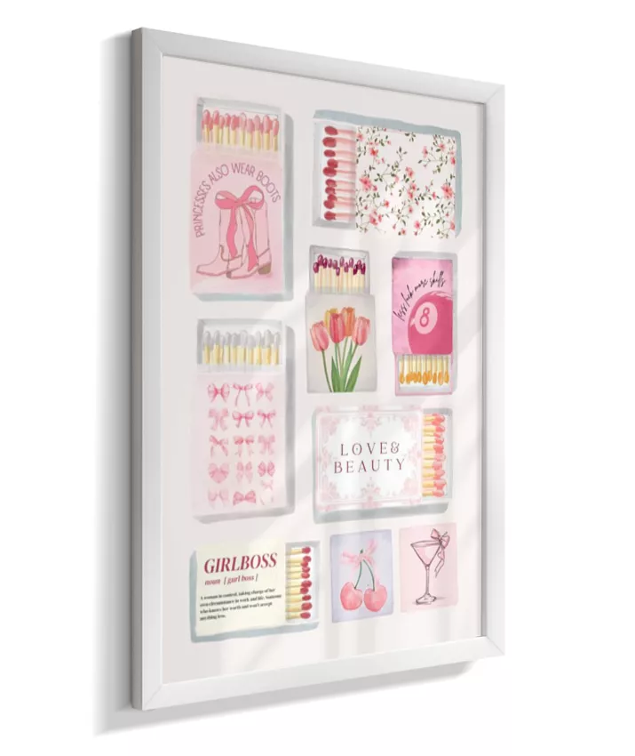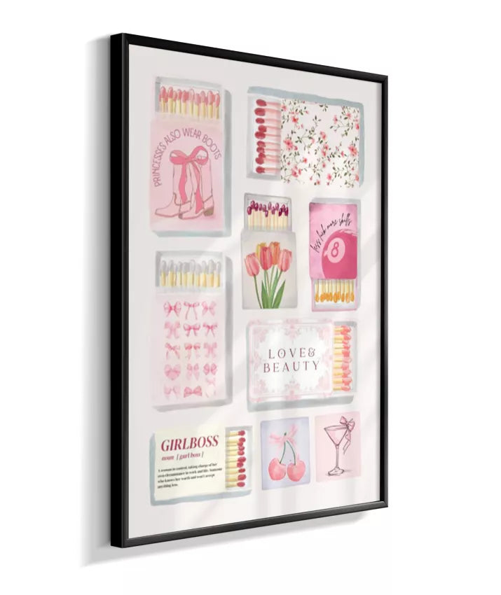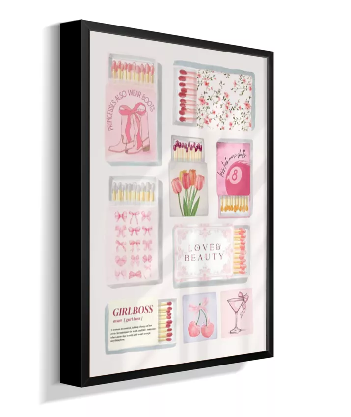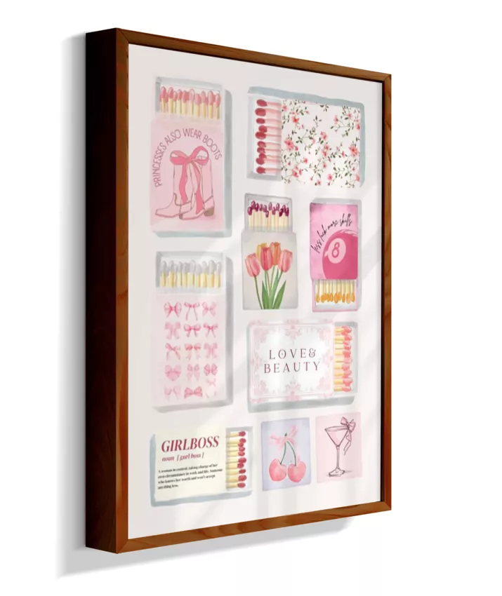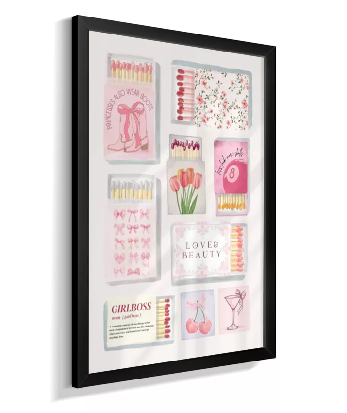 Matchbox é um quadro vibrante e divertido que mistura caixinhas de fósforo vintage, ingressos (tickets) retrô e elementos pop, com frases ousadas e cores vivas. Uma arte nostálgica com toque moderno, perfeita para ambientes criativos e cheios de personalidade.
